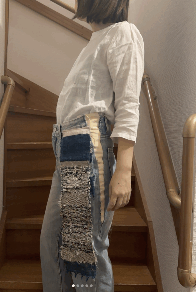そんで、ジーンズの両サイドを膝上くらいまでバシーっと切ってそこに帯の布を当てて、幅を広げてみましたら、めっっっちゃ履きやすくなった。履き心地最高。