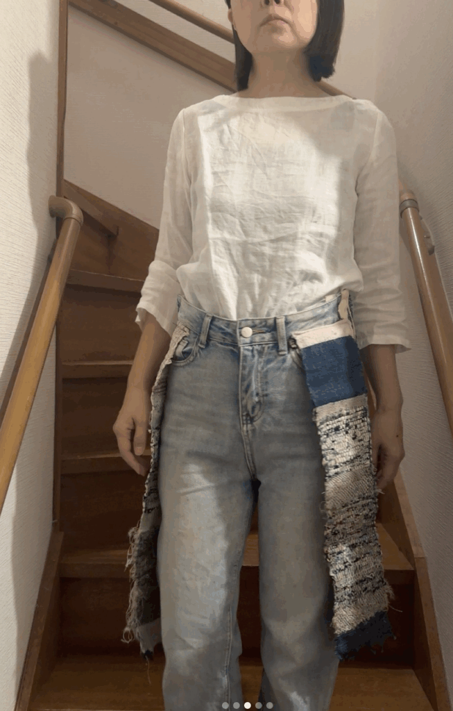 これいろんな布やアートヤーンをぶら下げても可愛いと思うので、アイデアは無限なのですが、今回は、着物や染めた布を裂いた裂き織りや、かせから外す時に絡まって、どーにもならなくなった絹糸を絡まったまま織った織物など、いろんな緯糸を織り込んでみた以前に作ってあった創作布を、途中から短く切って、ヒップと、前のラインにぶら下げてみた。